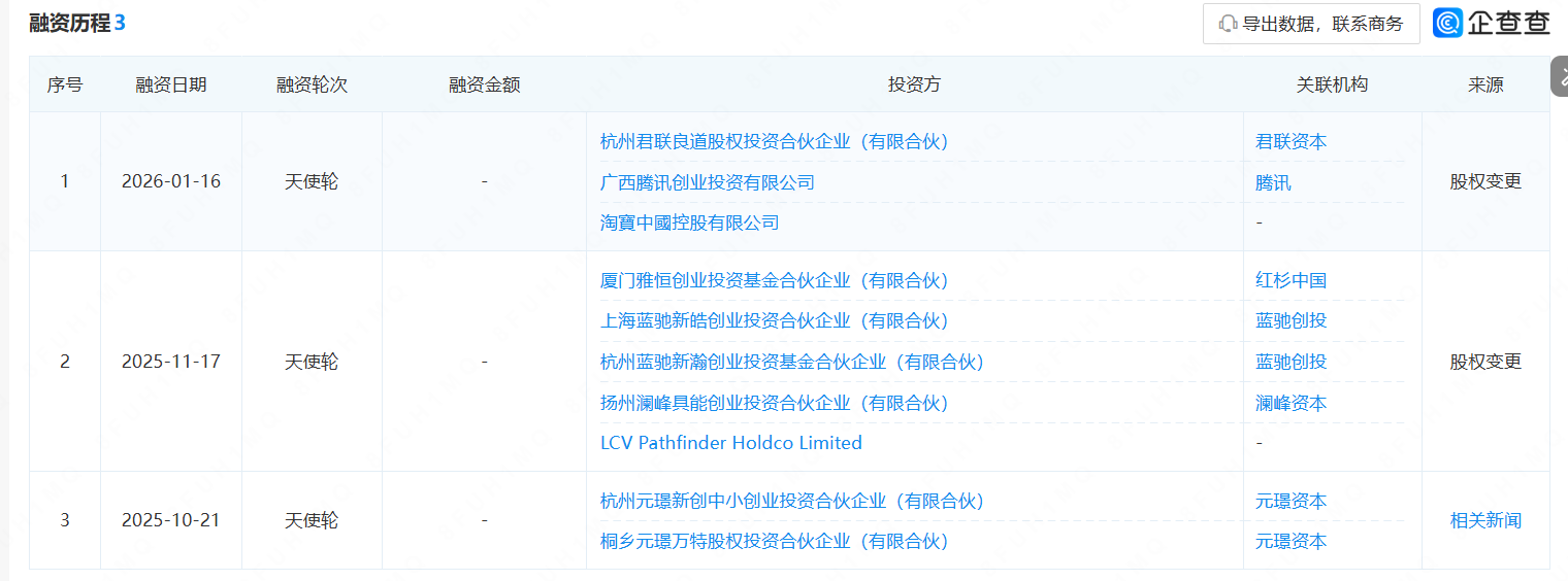 值得注意的是,腾讯与淘宝此次入股为公司天使轮第三轮融资,同期参投的还有联想控股(03396.HK)旗下的君联资本。在2025年11月的天使轮第二轮融资中,参投的有红杉中国、蓝驰创投与澜峰资本;2025年10月的天使轮首轮融资中,元璟资本参投。